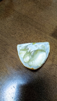 急いで窓際へ走って行くので、文旦を切って枝に刺してみました