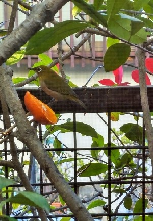 ミカンの上部分にいるのは「メジロ」です